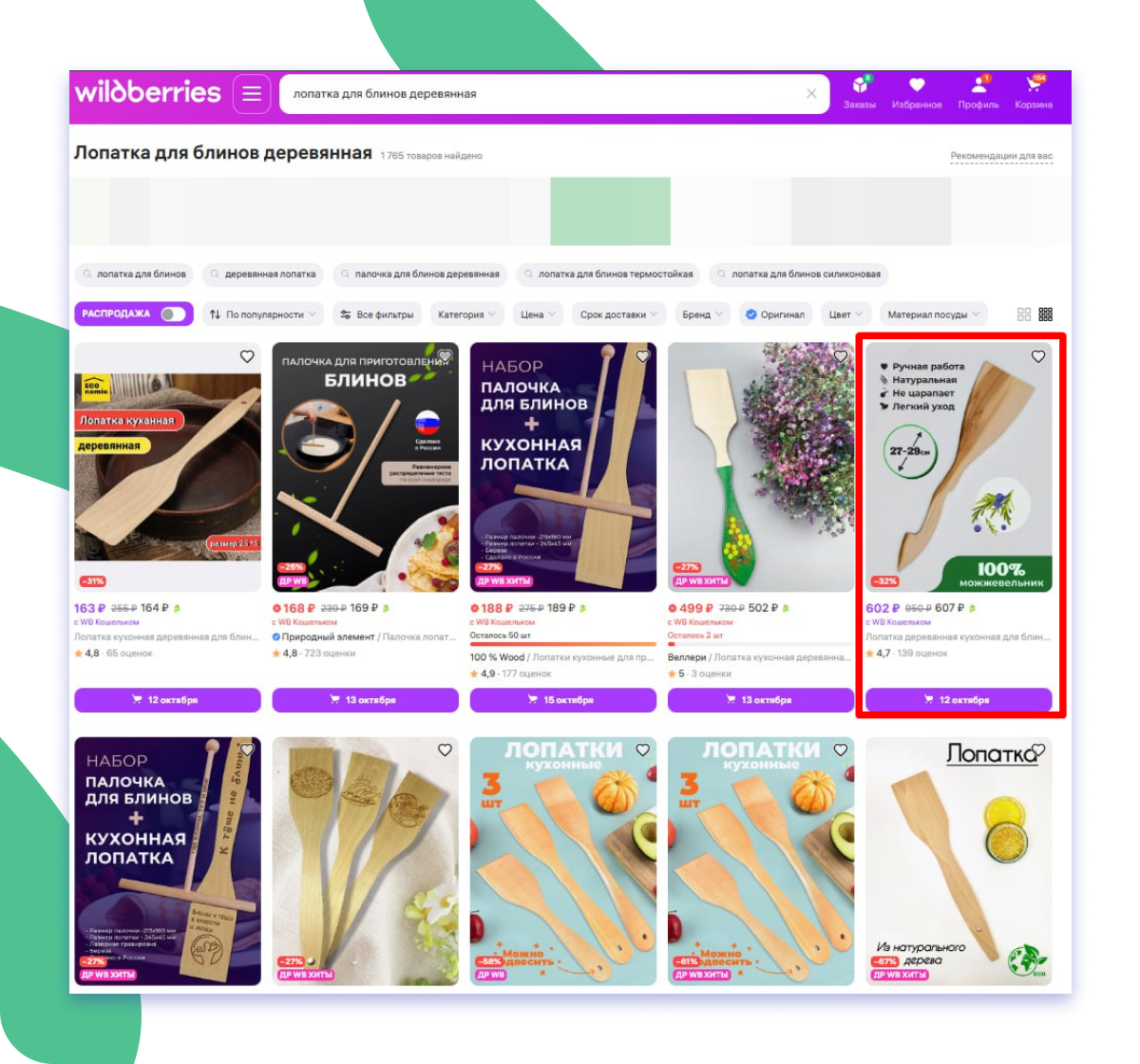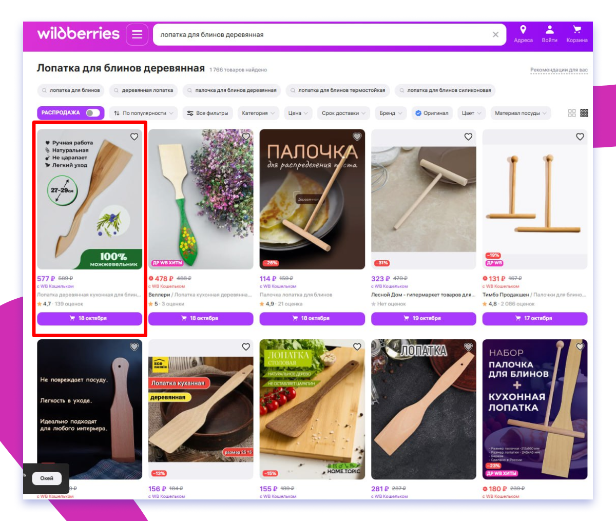 Пример 1: Выдача по запросу «лопатка для блинов деревянная» без авторизации.
