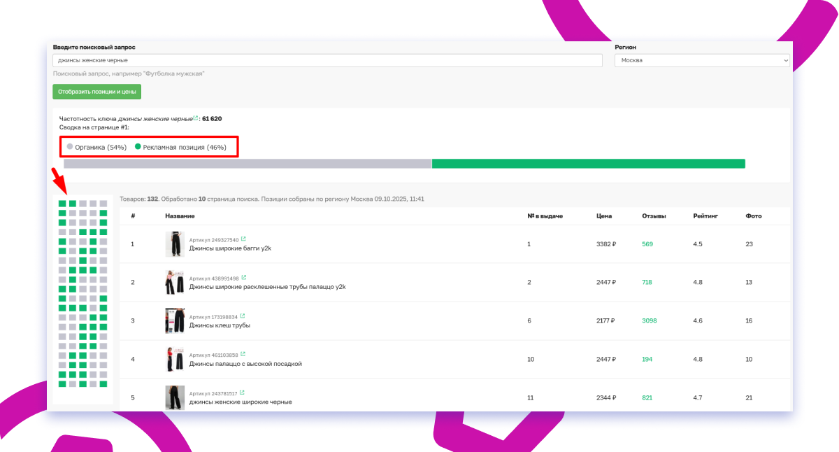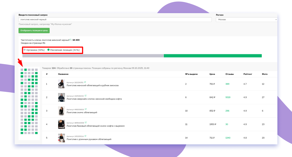 Подтверждение того, что в ТОПе есть и органика, и реклама, можно увидеть в инструменте Проверка ставок, где показана мини-карта позиций и процентное соотношение органики и рекламы ТОП-100.