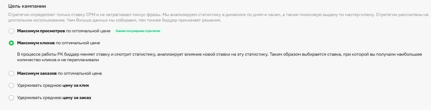 3. Если товар неплохо продается и есть шанс его сбыть, а селлер принял решение продавать дальше, можно на 1-2 недели усилить продажи рекламой. В биддере Sellego можно выбрать одну из стратегий — например, максимум показов или максимум заказов, а также настроить лимиты, чтобы не торговать себе в минус.