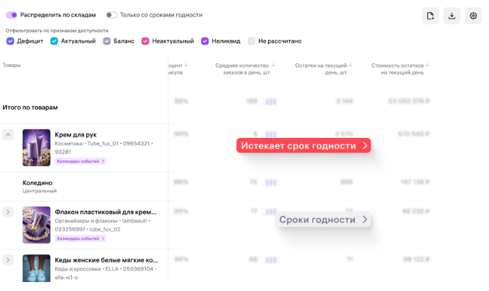 Детализация и срочные уведомления. Рядом с остатками теперь можно увидеть кнопку «Сроки годности». При клике кнопка открывает полную раскладку по складам, применяется по каждому артикулу. Главное: если до конца срока годности остается менее 30 дней, кнопка становится красной с текстом «Истекает срок годности». Оттуда же можно сразу перейти к оформлению возврата по проблемным позициям.