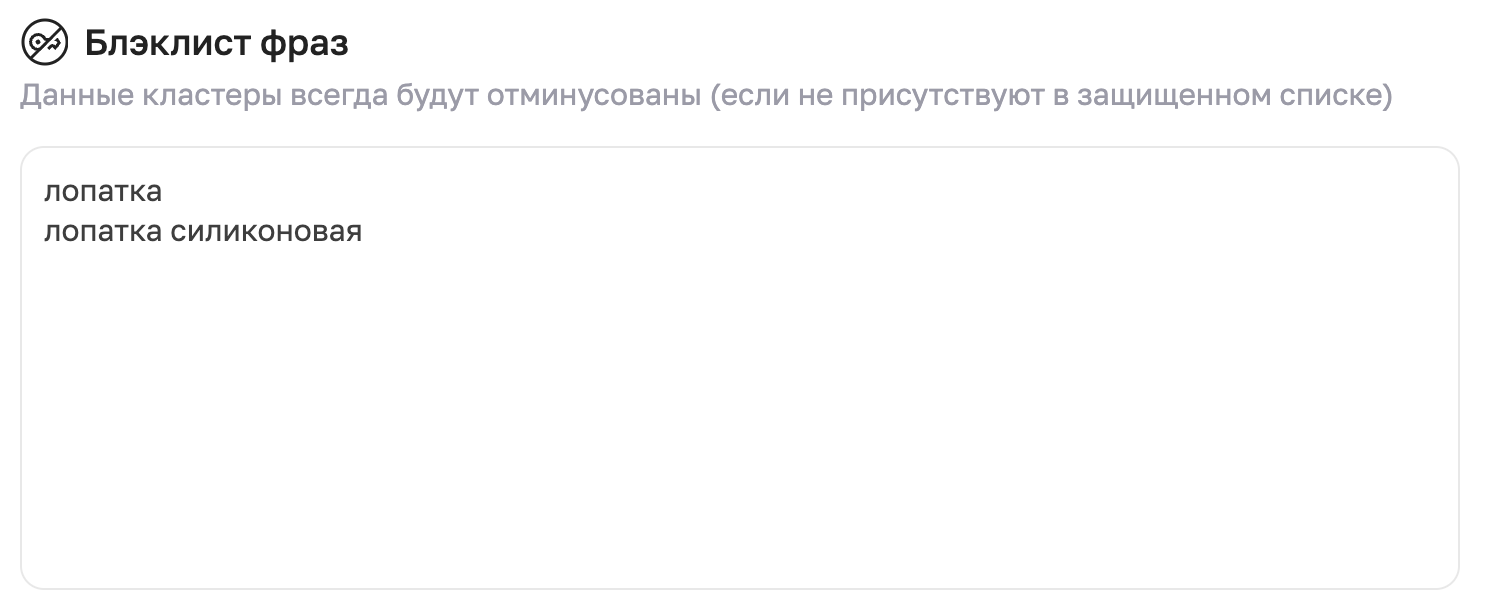 Под списком кластеров добавили больше возможностей для работы со списком фраз. Раньше можно было только включать/выключать показы, теперь можно добавлять/исключать фразы из защищённого списка и из Блэклиста. Это удобно, если вы собрали список нужных фраз где-то в другом месте и хотите сразу выполнить действия по соответствующим кластерам — вводите список и жмёте на кнопку нужного действия.