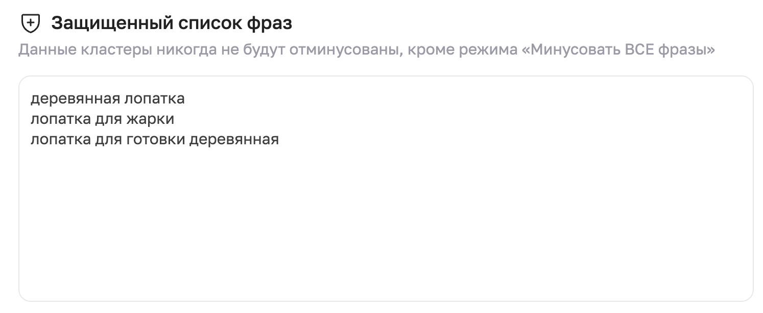 Белый список фраз переименовали в Защищённый список фраз. Зачем? Раньше был Белый список внутри режима "Белый список" и Защищённый список внутри режима "Автоминусация по критериям". Это дублировало логику и путало. Теперь оба списка объединены в один — Защищённый список.