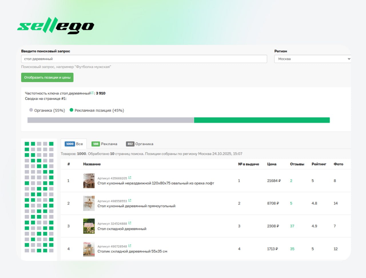 Теперь вы видите более полную картину продвижения товара. Если наш бот находит ваш товар сначала на органической позиции (например, 816), а потом на рекламном месте (например, 10) — мы покажем это как 816 → 10. При наведении на ячейку вы увидите время, когда бот зафиксировал каждую позицию.