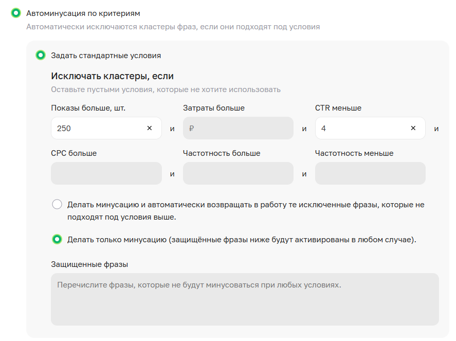 Применена автоминусация фраз — «Минусация по критериям»: показы больше 250, CTR меньше 4%.
