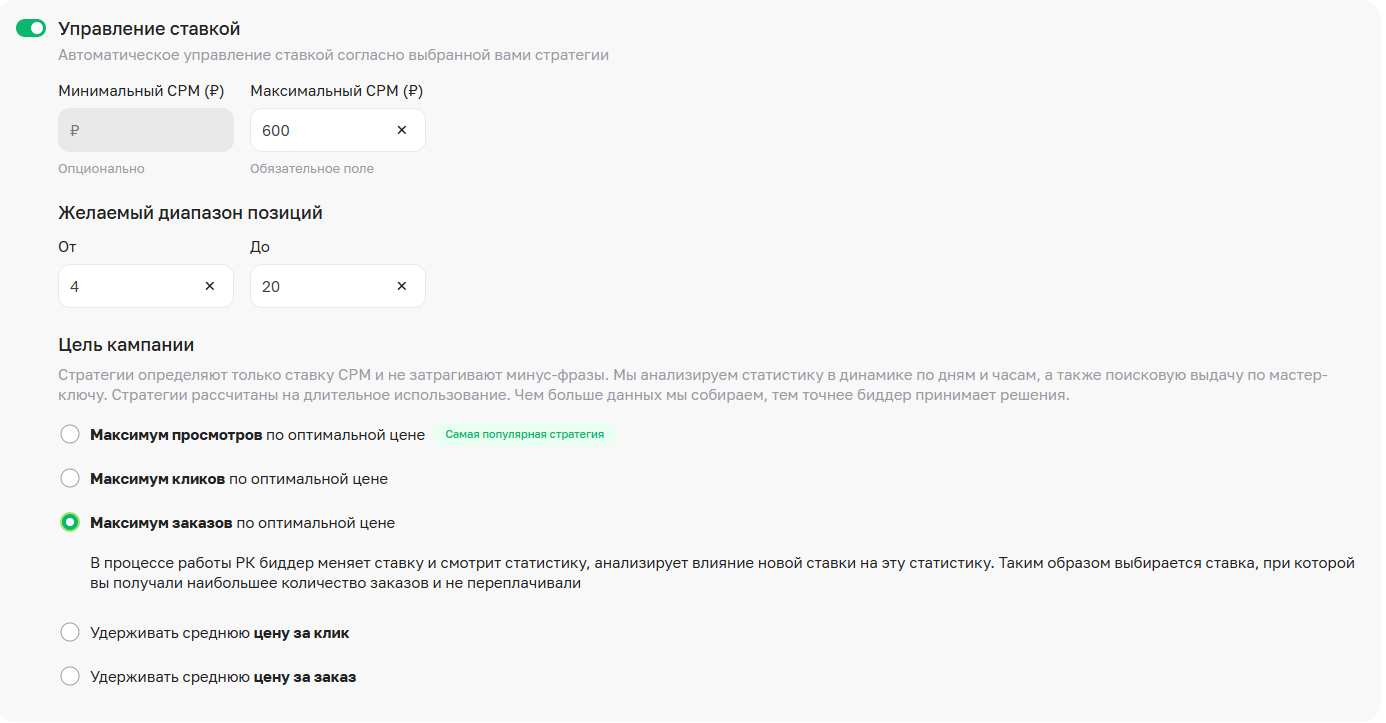 В биддере выбрана стратегия «Максимум заказов по оптимальной цене», задан диапазон позиций 4-20, задана максимальная ставка 600 руб.