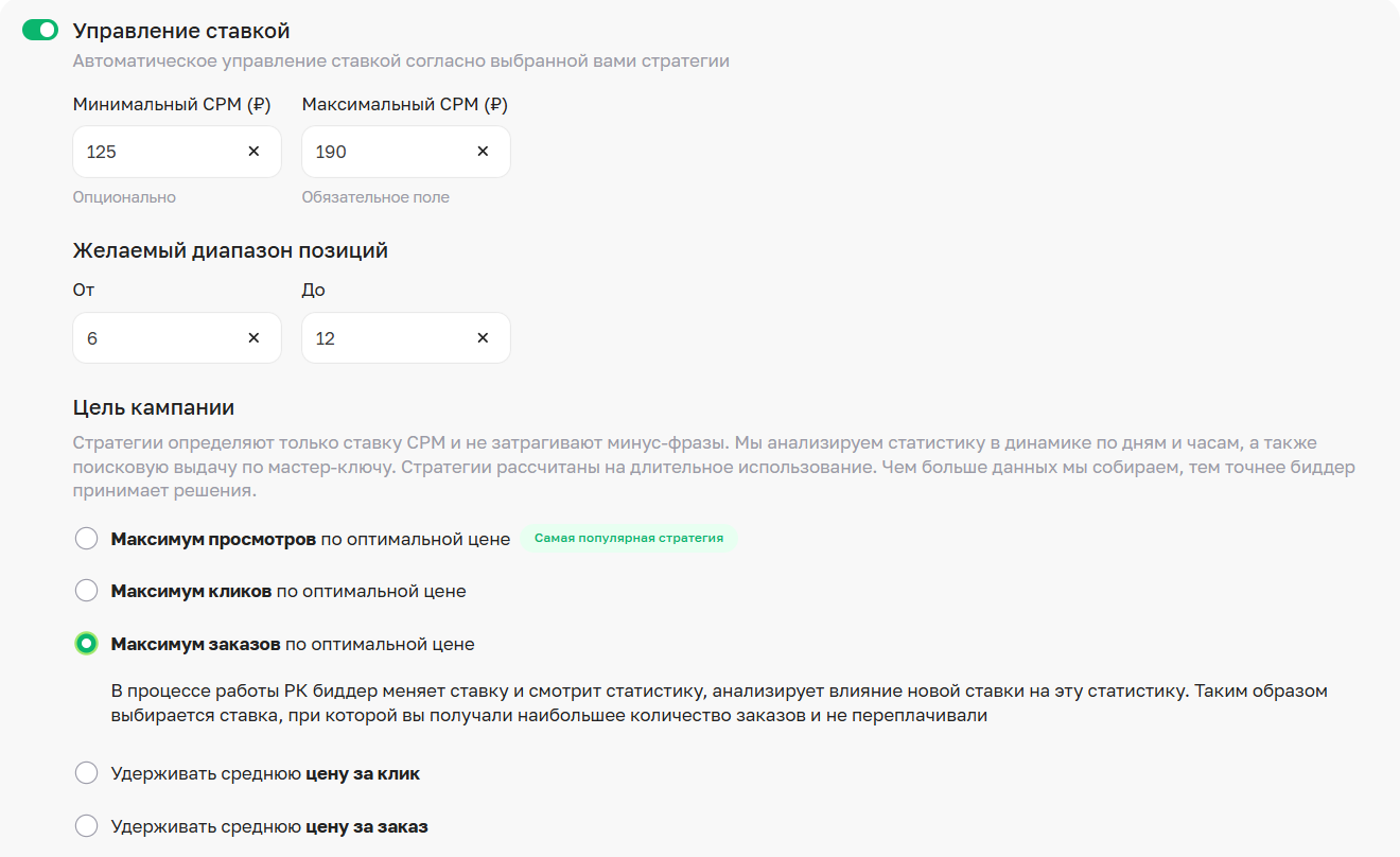 - выбрана стратегия управления ставкой «Максимум заказов» с удержанием позиций;