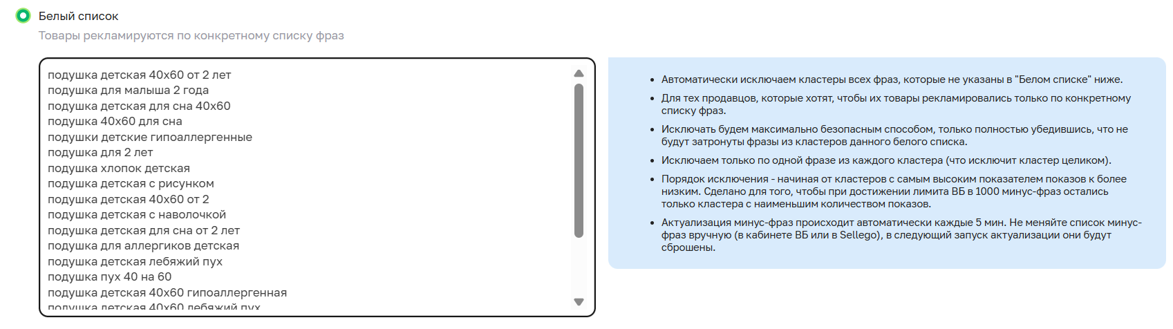 подключено автоуправление фразами «Белый список