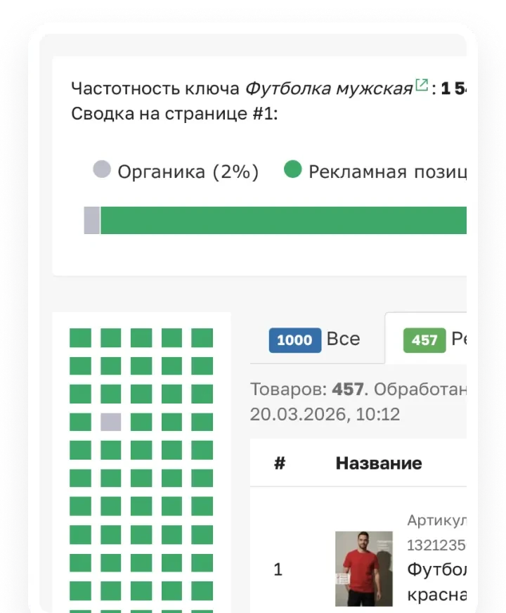 Маркировка рекламных мест в результатах поиска Вайлдберриз. Узнавайте, как делится выдача между рекламными и органическими позициями WB. Используйте аналитику SERP, чтобы более точно настраивать кампании, т.к. соотношение ключей часто меняется.