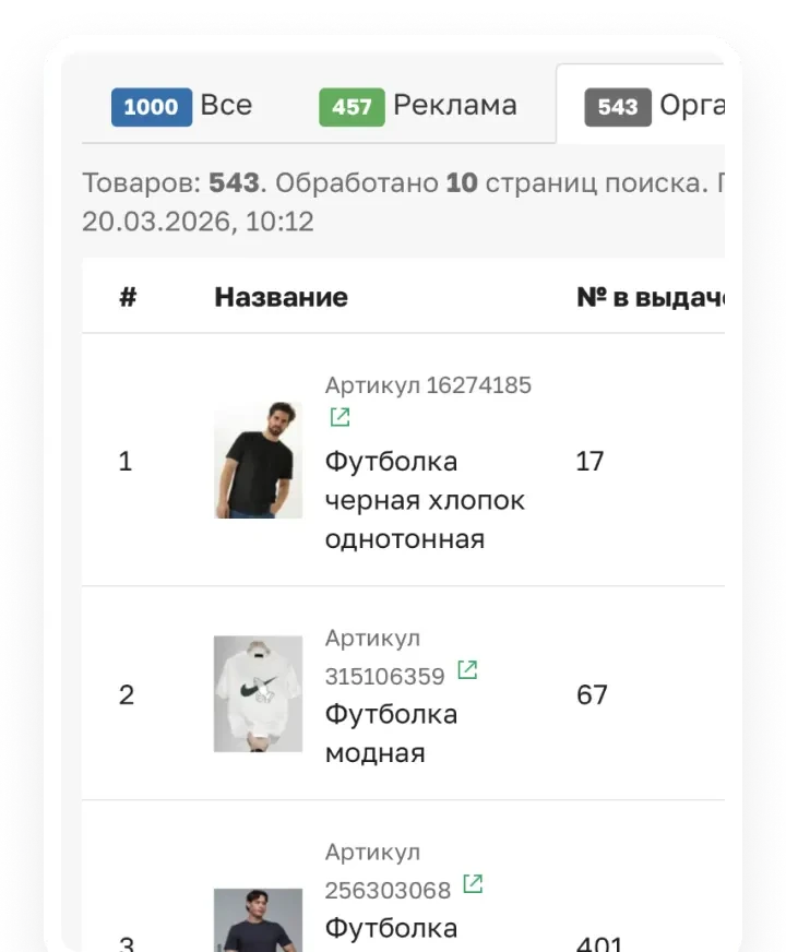 Быстрый сбор карточек из реальной поисковой выдачи WB по нужному ключевому запросу. Оценивайте конкурентноспособность вашего артикула в сравнении с другими товарами. Или просто анализируйте, кто занимает лидирующие позиции ВБ по 9 доступным гео.