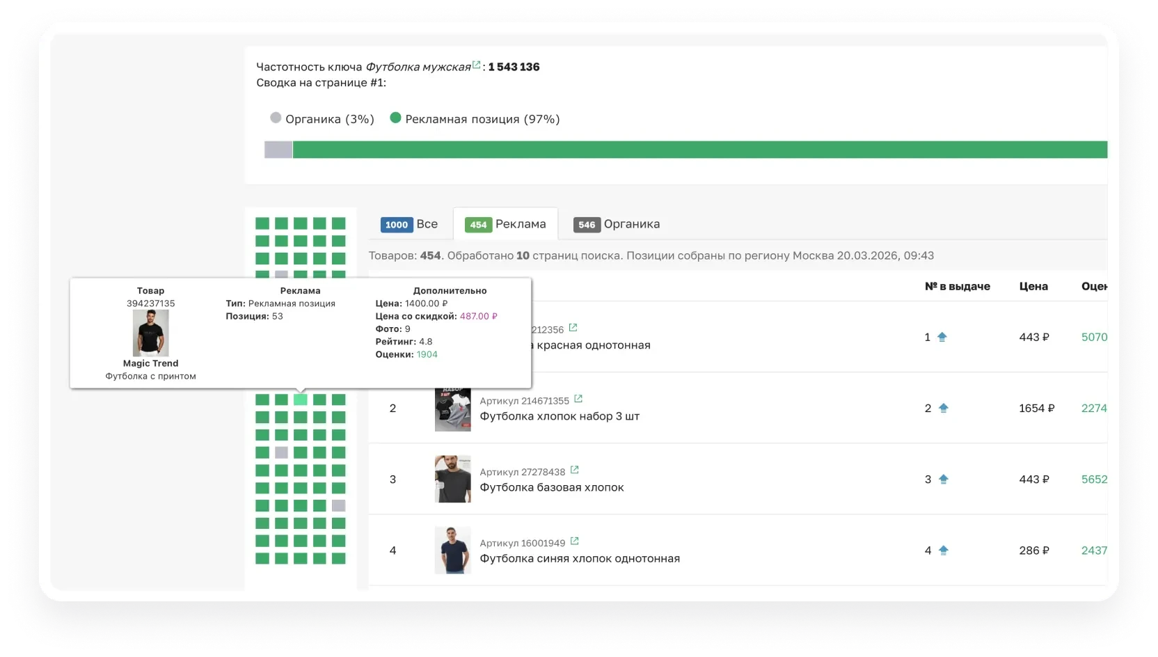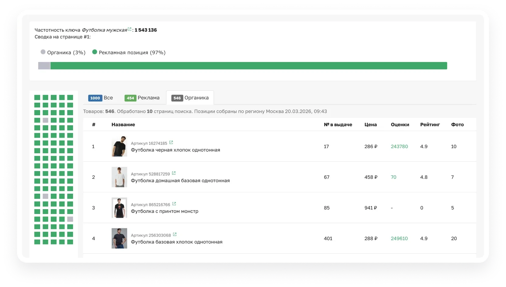 - Позволяет анализировать отдельно товары, которые оказались в результатах: органические и с включенной рекламой.
