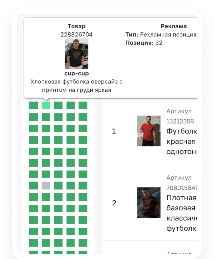 SERP поможет быстро проверить позиции артикулов конкурентов, а также изучить важные показатели карточек без перехода на отдельную страницу.
